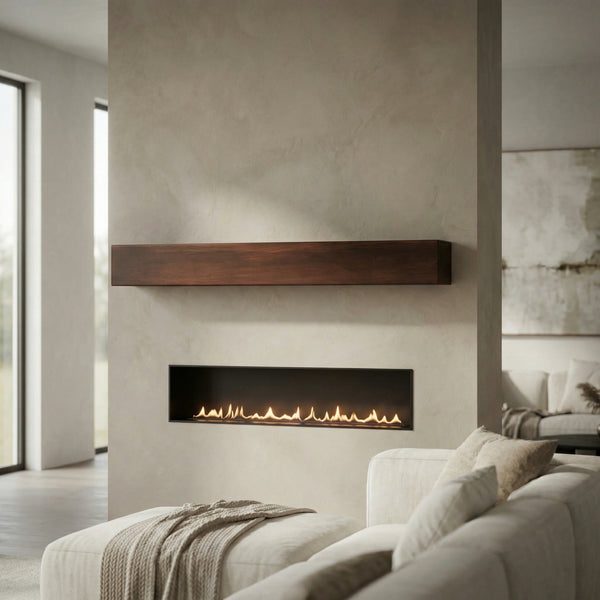 Custom mantel shelves in steel, wood, glass, and concrete — sized exactly for your fireplace and home.